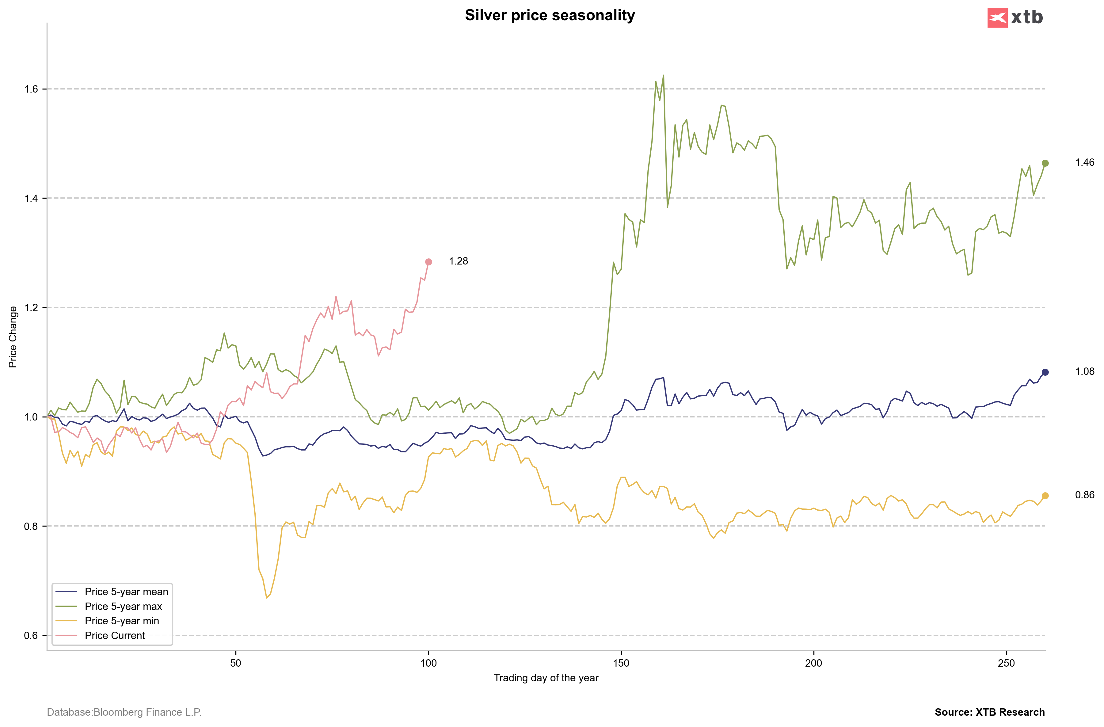 Srebro zyskuje już 28% w tym roku i odbiega od sezonowości. Jednak maksymalne zachowanie z ostatnich 5 lat pokazuje, że wcale nie jest to największy wzrost, którego ostatni doświadczyliśmy. Generalnie sezonowość wskazuje na wzrosty w okolicach 130-150 sesji w roku. Źródło: Bloomberg Finance LP, XTB