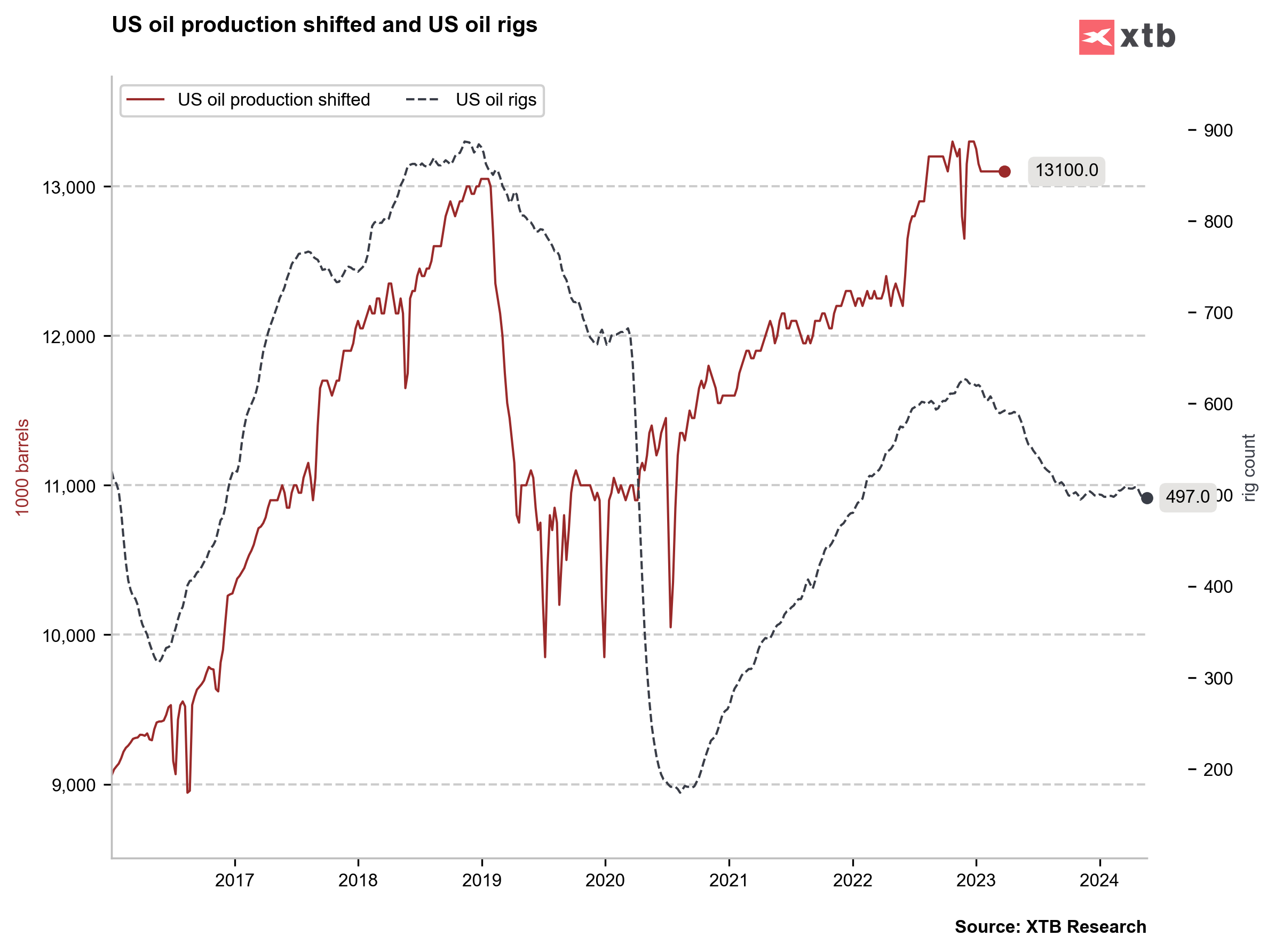 Patrząc na przesuniętą korelację między liczbą wież wiertniczych w USA oraz produkcją ropy, teoretycznie w najbliższym czasie amerykańscy producenci mogą mieć problem z utrzymaniem tak wysokiej produkcji. Źródło: Bloomberg Finance LP, XTB