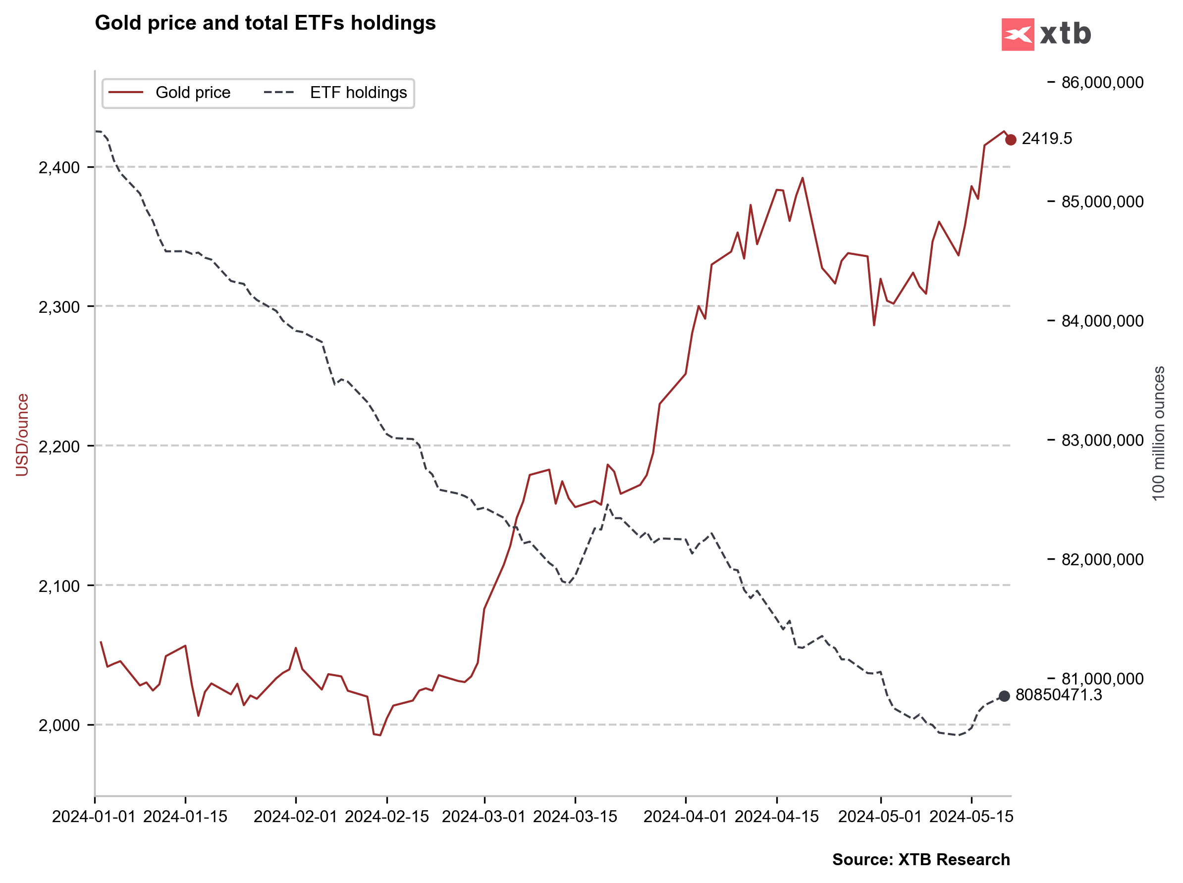 - Po ostatnim odbiciu złota od początku maja, ETFy ruszyły do kupowania złota. Jest to największy przyrost od marca tego roku.