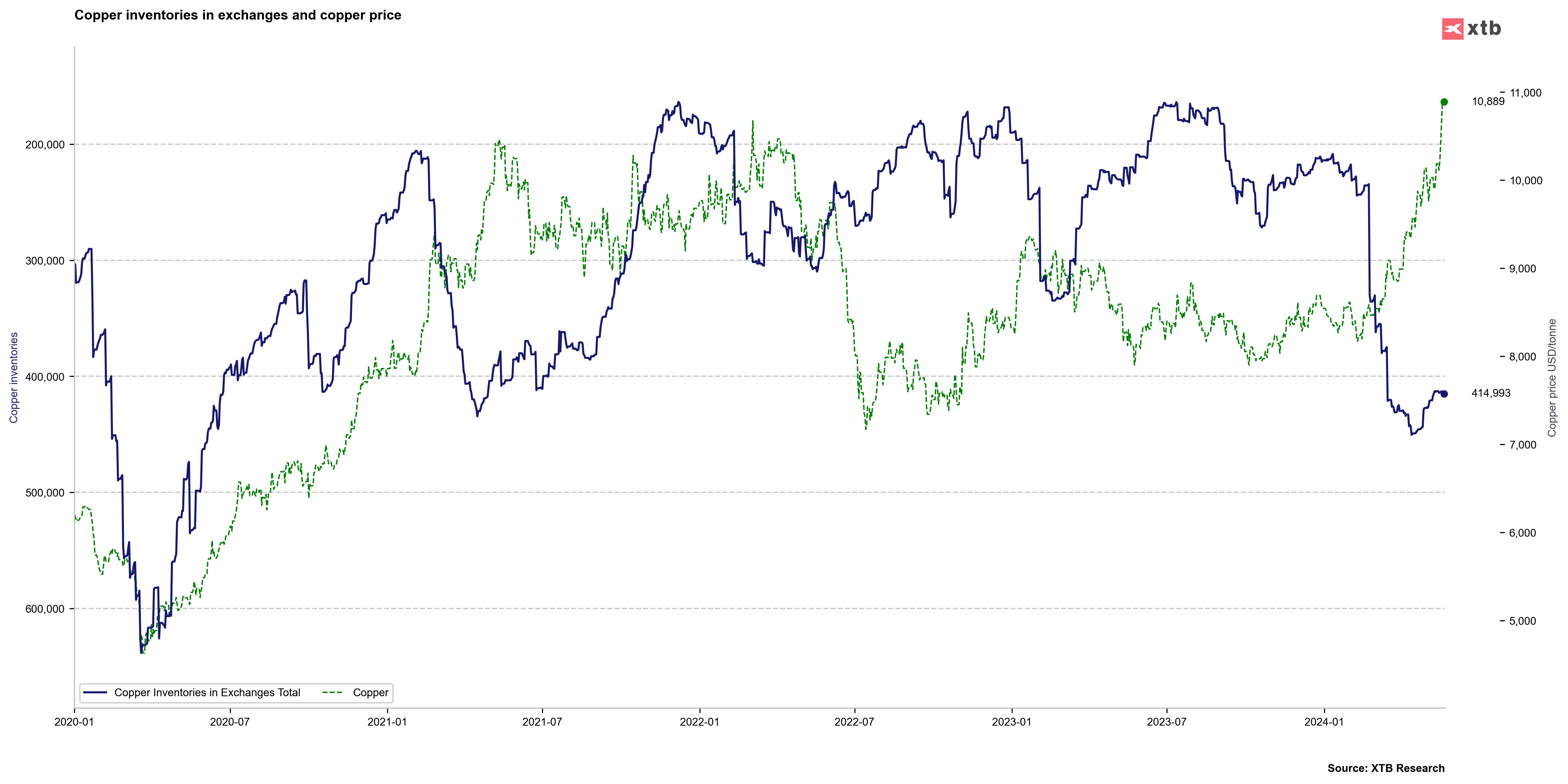 Zapasy miedzi na giełdach pozostają wysokie, co pokazuje, że popyt pozostaje ograniczony. Źródło: Bloomberg Finance LP, XTB