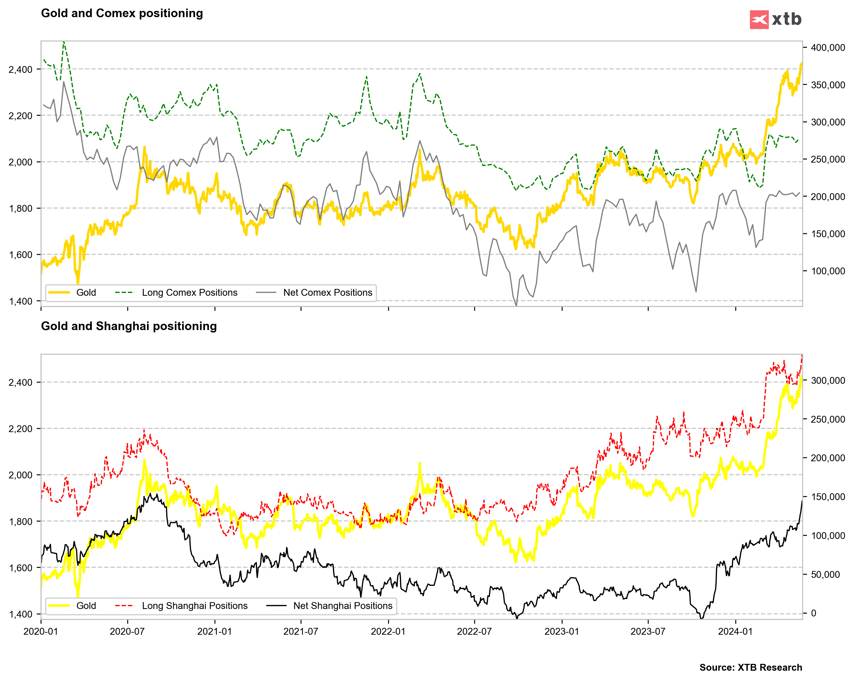 Pozycjonowanie na COMEX nie ulega dużym zmianom w ostatnim czasie, ale pozycje długie na giełdzie w Szanghaju bardzo mocno rosną. Pozycje netto są najwyżej od 2020 roku. Źródło: Bloomberg Finance LP, XTB
