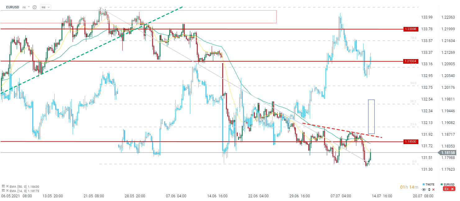 EURUSD odbija od ważnego wsparcia, pomimo nasilającej się presji inflacyjnej i sygnałów, że Fed mógłby coś zrobić, jeśli uzna, że inflacja faktycznie nie jest przejściowa. Oczywiście kluczowe stwierdzenie dotyczy braku znacznego progresu, który zagwarantowałby zmiany. To właśnie ten czynnik powoduje odbicie na EURUSD oraz spadek rentowności. Źródło: xStation5
