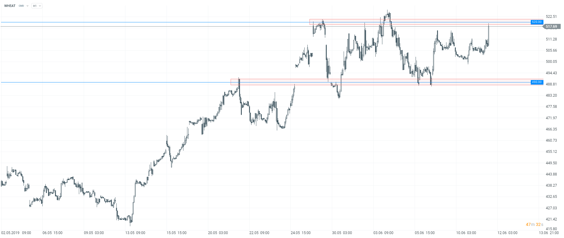 Wyraźny ruch w górę możemy obserwować także na pszenicy. Tutaj podobnie jak na kukurydzy, mogliśmy w ostatnim czasie obserwować konsolidację. Jeżeli poziom 520 zostanie pokonany, ruch w górę powinien przyspieszyć.