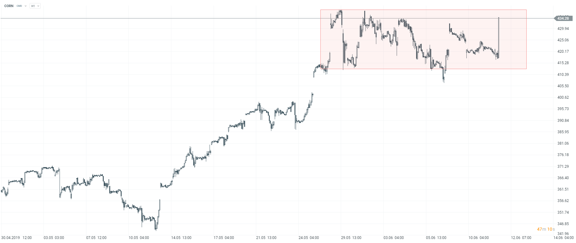Patrząc typowo techniczne na wykres, istnieje szansa na wybicie z lokalnej konsolidacji. Jeżeli górne ograniczenie “boxa” zostanie pokonane, ruch wzrostowy może przybrać na sile. W konsekwencji może się rozpocząć kolejny impuls w górę. Przebicie poziomu 440 centów za buszel powinno być zapalnikiem dalszego ruchu w kierunku północnym.
