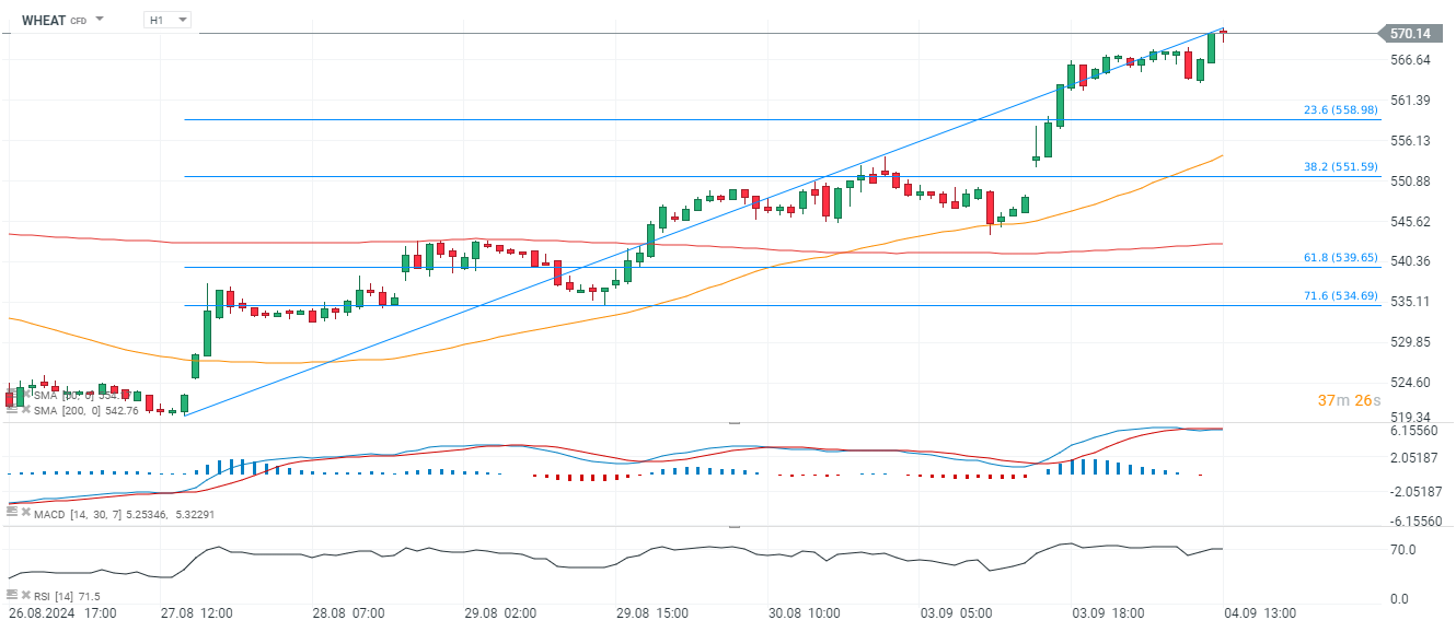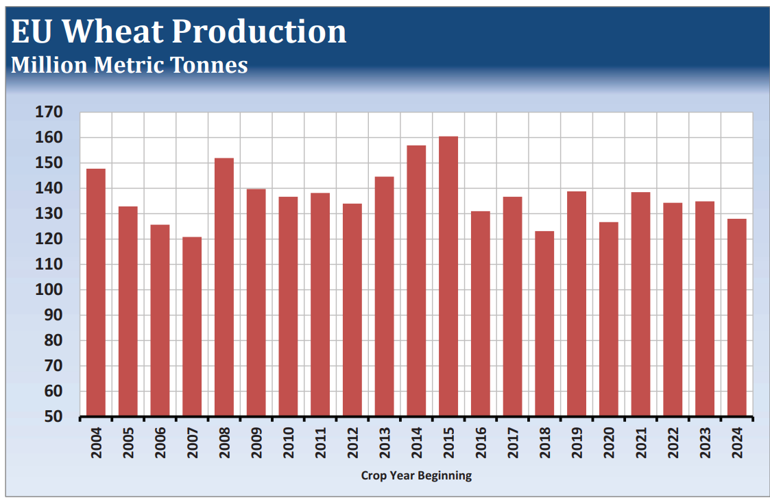 UE, Rosja i region Morza Czarnego zgłoszą w tym roku niższą produkcję pszenicy. Produkcja pszenicy użytkowej w UE spadła z 121 tys. ton do 116 tys. ton, według obecnych prognoz. Badania Argus również obniżyły prognozy dla upraw we Francji do 25,17 mln ton w tym roku (o 23% mniej w ujęciu rocznym). Ukraina również skomentowała, że produkcja może spaść o 15% z obecnych poziomów. Prawdopodobnie eksport z USA będzie solidny, w obliczu niższej podaży wśród głównych eksporterów.
