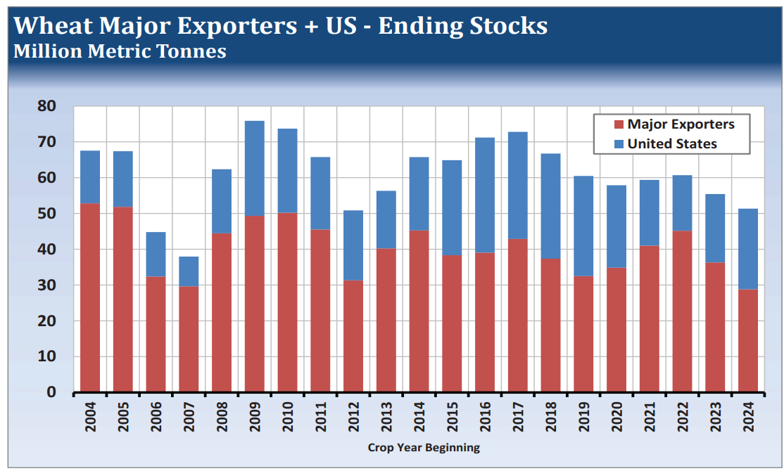 Końcowe zapasy głównych eksporterów spadają trzeci rok z rzędu, podczas gdy zapasy w USA są nadal solidne. Źródło: Hightower Report