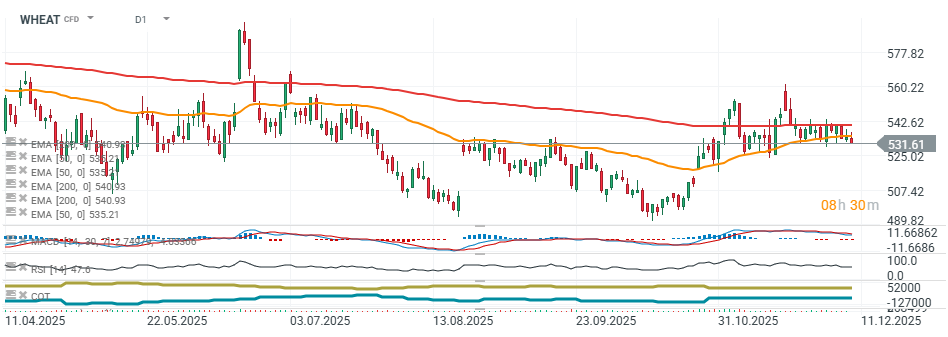Patrząc na wykres, widzimy, że sentymenty na rynku pszenicy osłabły, a rynek z trudem utrzymuje ceny w wąskim przedziale 530 - 450 od 21 listopada. Spadek poniżej 530 mógłby otworzyć drogę dla większego spadku. Z kolei wzrost powyżej 545 uprawdopodobniłby test lokalnych maksimów, przy 560.