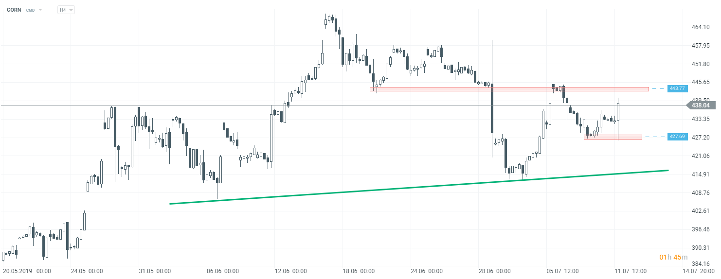 Cena kukurydzy również rośnie w pierwszych minutach po publikacji raportu. Wsparcie przy poziomie 427,5 jest bronione. Widoczna formacja głowy z ramionami ma coraz mniejsze szanse na realizację. Aktualnie opór może stanowić strefa przy poziomie 444. Jego ewenutalne pokonanie, otworzy drogę do większych wzrostów. Źródło: xStation5