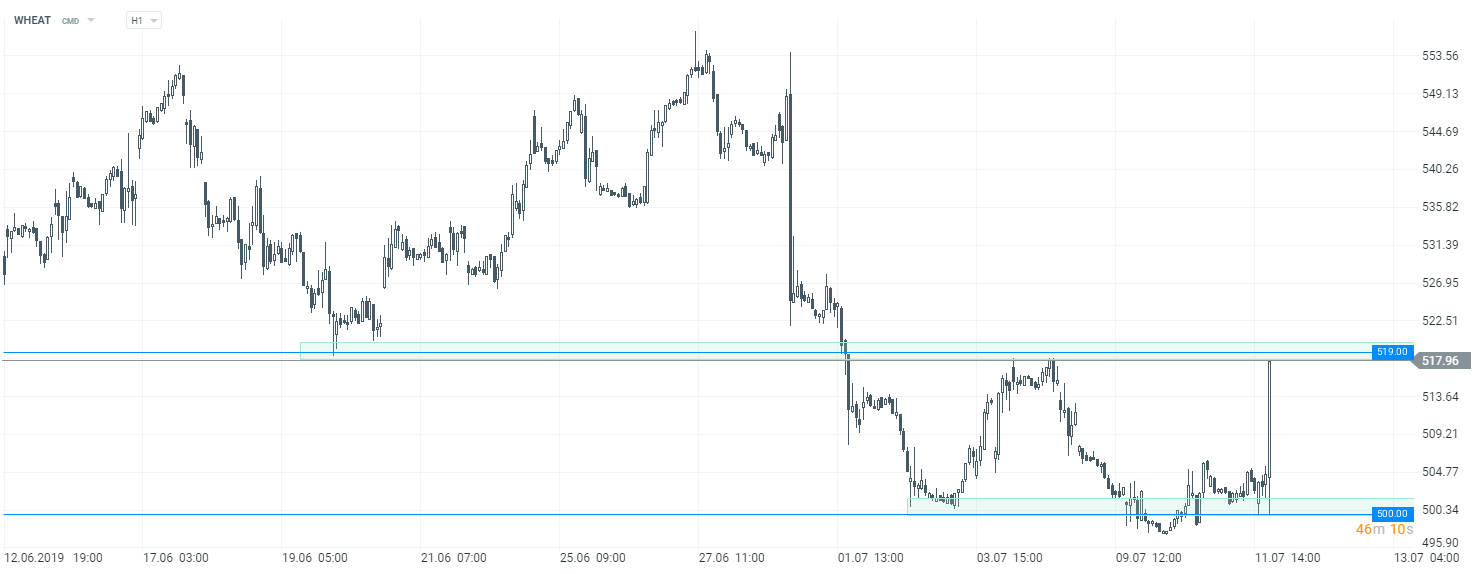 Cena pszenicy w górę po publikacji raportu WASDE. Po obronie wsparcia przy poziomie 500, testowany jest opór prz 519. Źródło: xStation5
