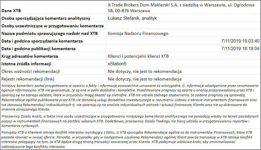 Ta publikacja handlowa jest informacyjna i edukacyjna. Nie jest rekomendacją inwestycyjną ani informacją rekomendującą lub sugerującą strategię inwestycyjną. W materiale nie sugerujemy żadnej strategii inwestycyjnej ani nie świadczymy usługi doradztwa inwestycyjnego. Materiał nie uwzględnia indywidualnej sytuacji finansowej, potrzeb i celów inwestycyjnych klienta. Nie jest też ofertą sprzedaży ani subskrypcji. Nie jest zaproszeniem do nabycia, reklamą ani promocją jakichkolwiek instrumentów finansowych. Publikację handlową przygotowaliśmy starannie i obiektywnie. Przedstawiamy stan faktyczny znany autorom w chwili tworzenia dokumentu. Nie umieszczamy w nim żadnych elementów oceniających. Informacje i badania oparte na historycznych danych lub wynikach oraz prognozy nie stanowią pewnego wskaźnika na przyszłość. Nie odpowiadamy za Twoje działania lub zaniechania, zwłaszcza za to, że zdecydujesz się nabyć lub zbyć instrumenty finansowe na podstawie informacji z tej publikacji handlowej. Nie odpowiadamy też za szkody, które mogą wynikać z bezpośredniego czy też pośredniego wykorzystania tych informacji. Inwestowanie jest ryzykowne. Inwestuj odpowiedzialnie.