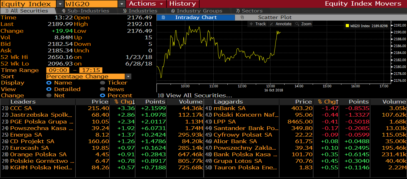 Dzisiaj poznaliśmy raport płacowy z polskiej gospodarki. We wrześniu 2018 roku przeciętne wynagrodzenie w sektorze przedsiębiorstw zwiększyło się o 6,7% r/r wobec konsensusu rynkowego na poziomie 7,1% r/r. Spowolnił wzrost zatrudnienia, które w poprzednim miesiącu wzrosło o 3,2% r/r, nieco poniżej oczekiwanych 3,4% r/r. Dziś poznamy jeszcze inflację bazową CPI, a konsensus rynkowy zakłada wzrost o 0,9% r/r. W ostatnim czasie część członków RPP zaczęła obawiać się, że wzrost cen energii może być jednym z czynników sprzyjających odbiciu CPI. W poniedziałek Grażyna Ancyparowicz (członek RPP) powiedziała, że nie wyklucza, że w drugiej połowie 2019 roku pojawi się potrzeba podwyżki stóp procentowych, co biorąc pod uwagę poprzednie komentarze ze strony prezesa NBP Adama Glapińskiego, który wykluczał podwyżki stóp do końca 2019 roku stanowi pewną nadzieję na szybsze rozpoczęcie zacieśniania polityki monetarnej. Jednym z beneficjentów wyższych stóp procentowych mógłby być sektor bankowy, który w całkowitej kapitalizacji indeksu WIG20 stanowi znaczny udział.