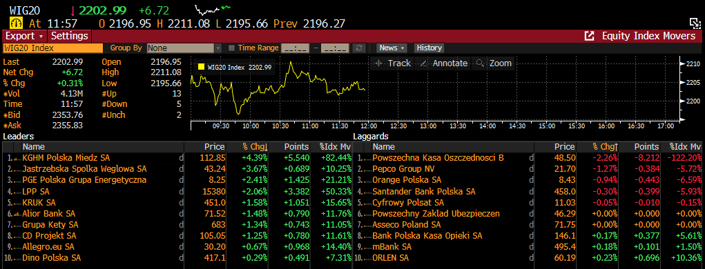 Mocne wzrosty KGHM i JSW, ale słabe walory PKO ciążą dziś na WIG20. Źródło: xStation5