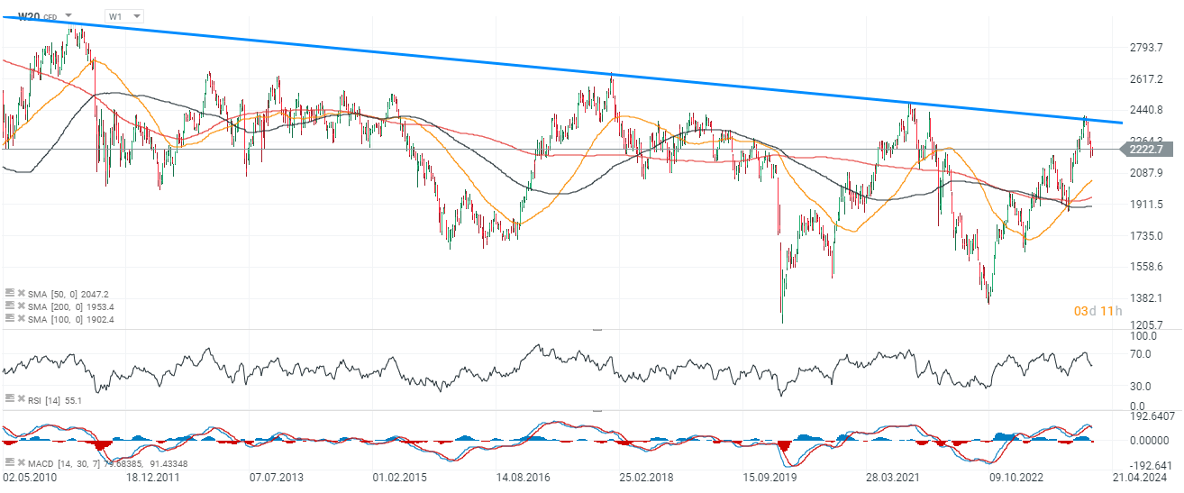 Patrząc na szerszy interwał, widzimy, że WIG20 notuje coraz niższe szczyty od blisko 15 lat. Potencjalne przełamanie powyżej 2500 punktów mogłoby położyć temu kres i odwrócić długoterminową słabość.