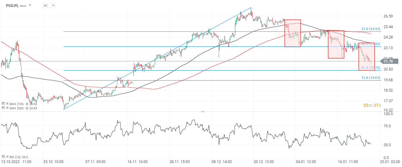 Akcje Pepco notują dziś spadki, które jeśli impulsy spadkowe w strukturze 1:1 zostaną zachowane, mogą znieść walory, do 20,7 PLN gdzie widzimy 61,8 zniesienie Fibonacciego fali wzrostowej z jesieni 2022 roku. Główny poziom oporu w przypadku odbicia to okolice 25 PLN, wyznaczony przez poprzednie reakcje cenowe, 23,6 Fibo i SMA200 (czerwona linia)