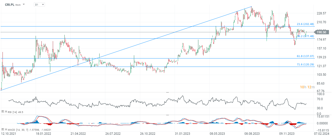 Akcje Creotechu zdołały wzrosnąć o blisko 300% od giełdowego debiutu. Obecnie kluczowe wsparcie znajduje się w okolicach 177 PLN za walor i wyznaczone jest 38,2 zniesieniem Fibo oraz poprzednimi reakcjami cenowymi z 2022 roku. Źródło: xStation5