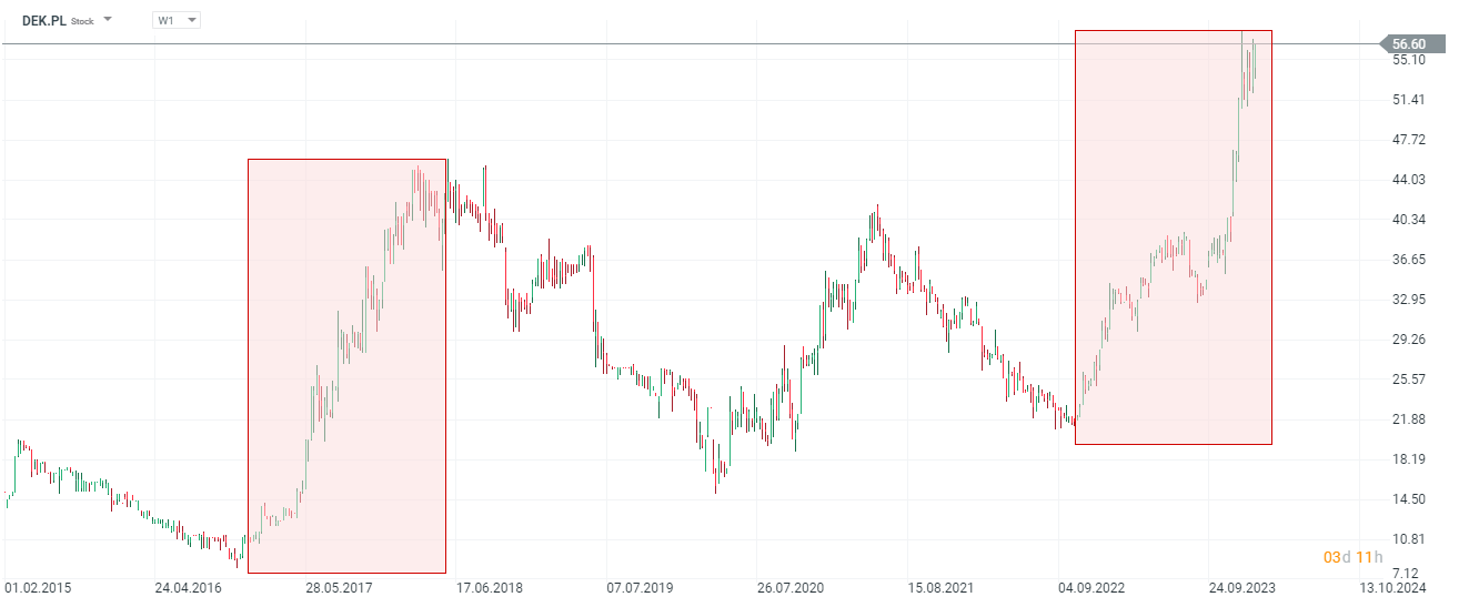 Zwyżka na akcjach Dekpolu (DEK.PL) pokazuje już skalę podobną do rajdu z lat 2016 - 2018. W scenariuszu głębszej korekty niewykluczony może okazać się test 46 PLN za walor.