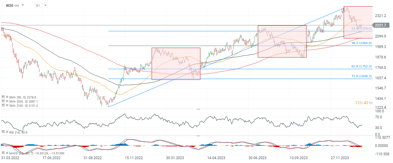 Patrząc na interwał dzienny, widzimy, że potencjalny zasięg spadków na W20 to okolice 2150 - 2100 punktów. Wówczas mielibyśmy utrzymaną geometrię rynku, ale przy mocnym odbiciu na rynkach globalnych, możemy zobaczyć zwyżkę nieco szybciej. Jak dotąd korekta nie sięgnęła poza 2160 punktów.