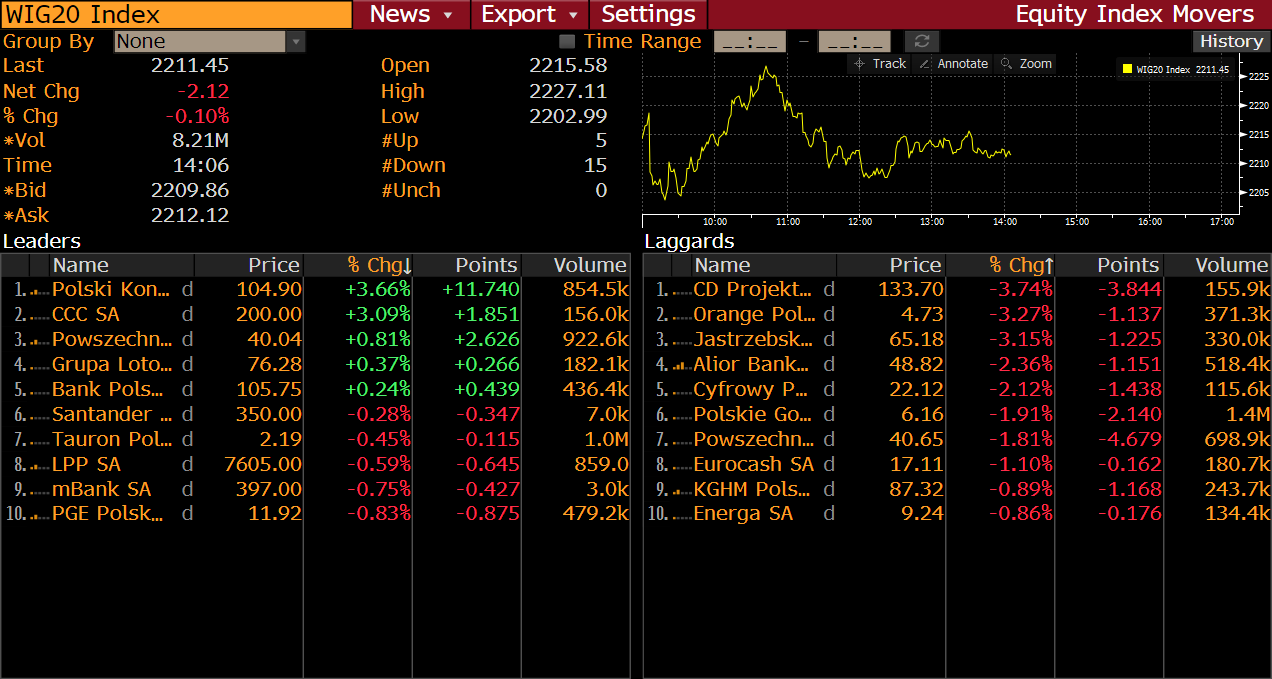 Z kolei PKN Orlen ponownie podchodzi w okolice szczytów z pierwszej połowy września. Ostatnie spadki na ropie naftowej pozwolą odbudować marże w końcówce roku. Spółka dodatkowo ogłosiła, że Anwil z Grupy PKN rozważa rozbudowę zdolności produkcyjnych chlorku winylu. Spółka ogłosiła postępowanie na opracowanie studium wykonalności dla modernizacji wytwórni tego związku. Oferty w postępowaniu można składać do 7 grudnia.