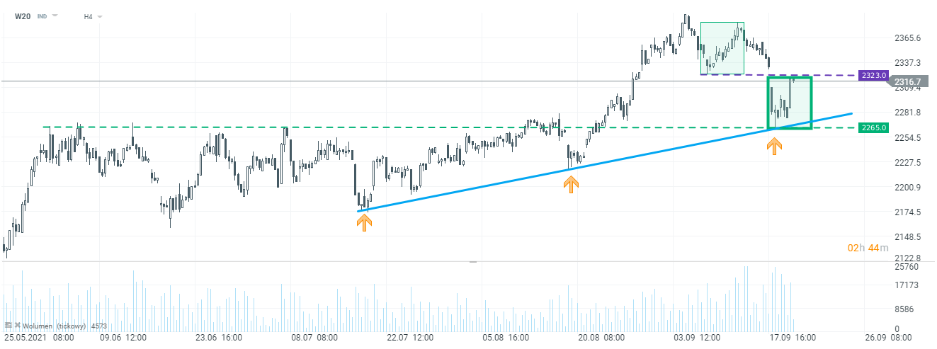Patrząc na kontrakty na WIG20 (W20) na interwale H4, widać, że poziom 2323 pkt, o którym wspominaliśmy w poprzednich wpisach, jest teraz pierwszym oporem dla strony popytowej. Rynek przetestował dziś te okolice, jednak nie doszło jeszcze do wybicia. Ciekawie wygląda również linia trendu wzrostowego (namalowana w oparciu o 3 reakcje cenowe). Poniedziałkowe dołki (2265 pkt) to z kolei ważne wsparcie - w tym miejscu przebiegały również lokalne maksima w maju, czerwcu i lipcu.