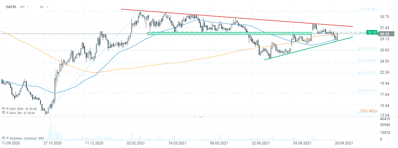 Przyjrzyjmy się wykresowi AmRest Holdings (EAT.PL). Kurs notuje dziś silne wzrosty i przebija zniesienie Fibonacciego 23,6% fali wzrostowej rozpoczętej w listopadzie 2020. Teraz kurs zbliża się do poziomu 30,50 PLN - w przeszłości w tej okolicy zachodziły liczne reakcje cenowe (m.in. lokalne minima z wiosny 2021). Wyjście powyżej mogłoby stanowić impuls do dalszej zwyżki, a pierwszą przeszkodą dla byków mogłaby być linia poprowadzona po lokalnych szczytach. Warto dostrzec na wykresie, że lekko nachylona linia trendu spadkowego (czerwona) oraz linia trendu wzrostowego (zielona) tworzą formację klina - niewykluczone, że wielu uczestników rynku zwraca właśnie uwagę na tę formację i ostatecznie dojdzie do wyraźnego wybicia w jedną ze stron.