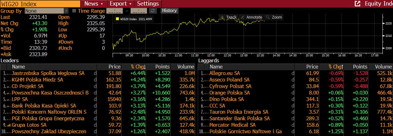 Przed godziną 14:00 jedynie 3 spółki wśród indeksu blue chipów notują spadki, które na dodatek nie przekraczają 1%. Silnie odbicie można z kolei dostrzec na kursie JSW (+6,44%) oraz KGHM (4,24%). Lepsze nastroje na rynkach wspierają ceny surowców, co pomaga właśnie spółkom z sektora surowcowego. Bardzo dobrze radzi dziś sobie również sektor finansowy. Indeks WIG-Banki zyskuje ponad 2,60%.