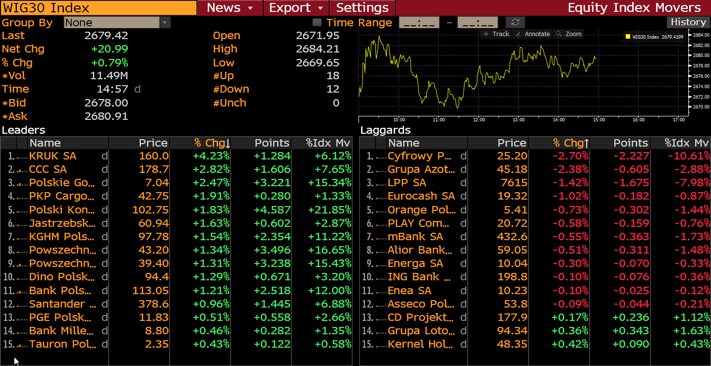 Kruk (KRU.PL) liderem wzrostów zarówno w indeksie WIG30 jak i w MWIG40. Żródło: Bloomberg.