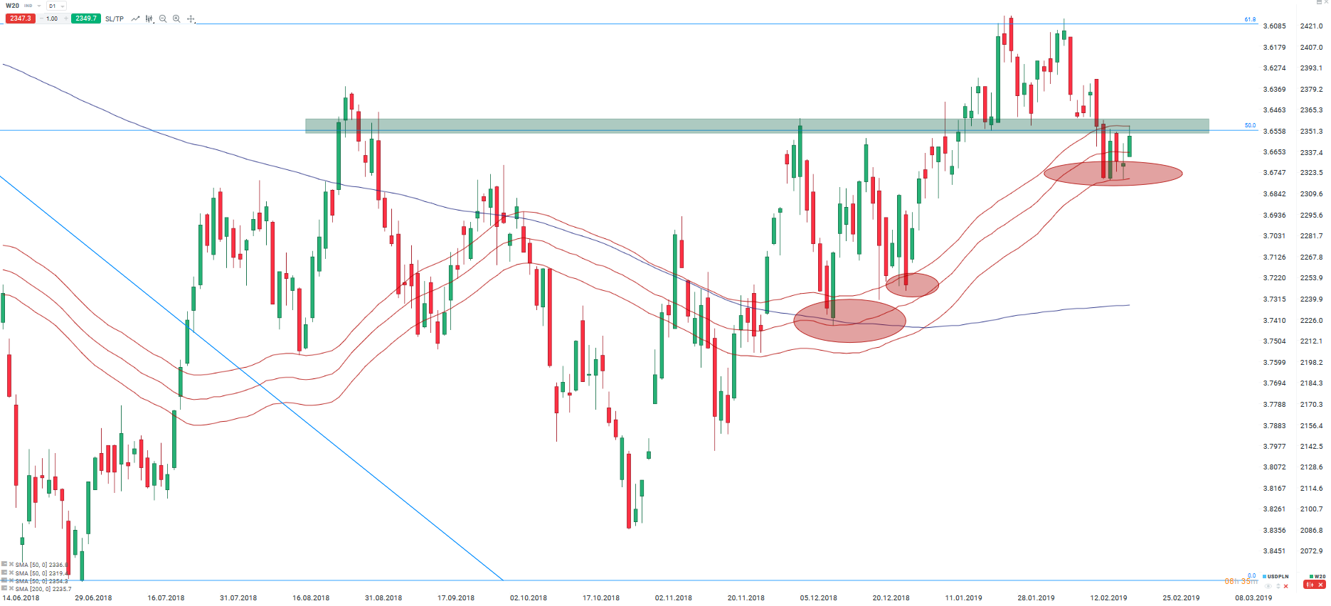 Dzisiaj mamy kolejną sesję, gdzie indeks WIG20 (W20) próbuje zarysować odbicie od kanału średnich 50-okresowych. Ten poziom był dla byków również pomocny w poprzednich miesiącach, skąd dochodziło do większych fal wzrostowych. Źródło: xStation5.