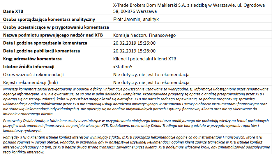 Ta publikacja handlowa jest informacyjna i edukacyjna. Nie jest rekomendacją inwestycyjną ani informacją rekomendującą lub sugerującą strategię inwestycyjną. W materiale nie sugerujemy żadnej strategii inwestycyjnej ani nie świadczymy usługi doradztwa inwestycyjnego. Materiał nie uwzględnia indywidualnej sytuacji finansowej, potrzeb i celów inwestycyjnych klienta. Nie jest też ofertą sprzedaży ani subskrypcji. Nie jest zaproszeniem do nabycia, reklamą ani promocją jakichkolwiek instrumentów finansowych. Publikację handlową przygotowaliśmy starannie i obiektywnie. Przedstawiamy stan faktyczny znany autorom w chwili tworzenia dokumentu. Nie umieszczamy w nim żadnych elementów oceniających. Informacje i badania oparte na historycznych danych lub wynikach oraz prognozy nie stanowią pewnego wskaźnika na przyszłość. Nie odpowiadamy za Twoje działania lub zaniechania, zwłaszcza za to, że zdecydujesz się nabyć lub zbyć instrumenty finansowe na podstawie informacji z tej publikacji handlowej. Nie odpowiadamy też za szkody, które mogą wynikać z bezpośredniego czy też pośredniego wykorzystania tych informacji. Inwestowanie jest ryzykowne. Inwestuj odpowiedzialnie.