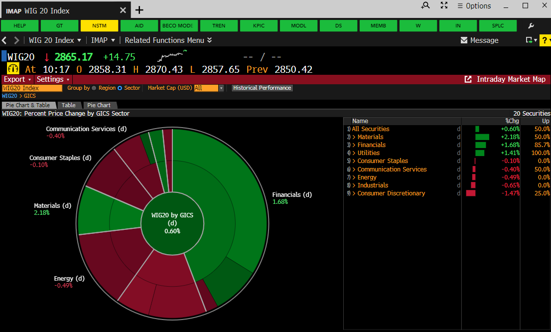 Na warszawskim parkiecie najlepiej radzą sobie dziś spółki z sektora górniczego i finansowego, które wspierają notowania indeksu WIG20. Po przeciwnej stronie rynku znajdują się przedstawiciele branży tekstylnej, które znajdują się pod presją.