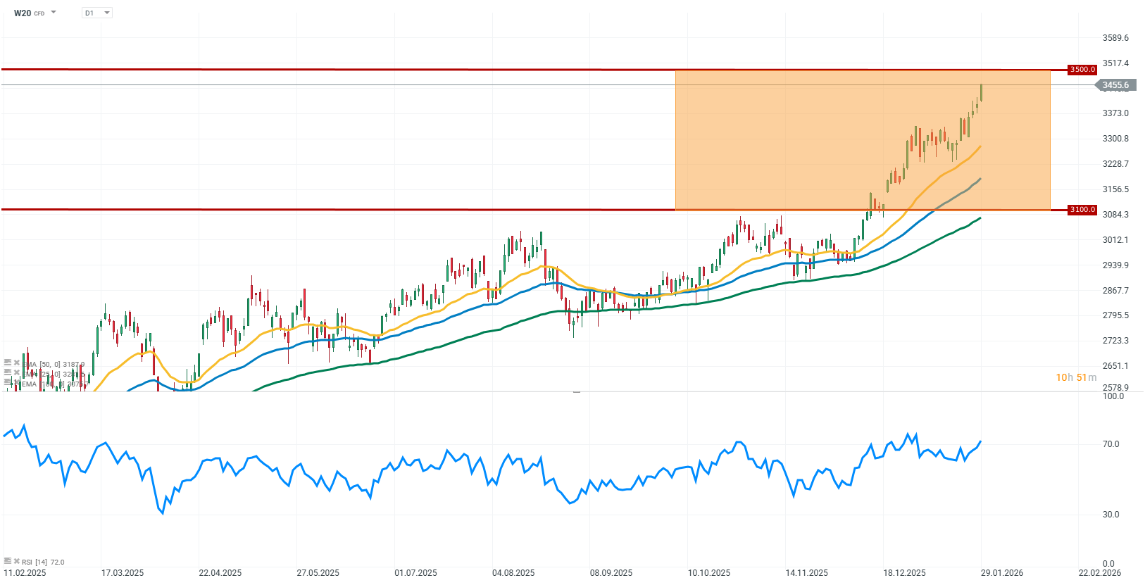 Kontrakty na indeks WIG20 notują kolejny znaczny wzrost, śrubując kolejne rekordy. To kolejny dzień z rzędu, kiedy ceny idą do góry, zbliżając się do ważnego poziomu 3500 punktów. Moment sprzyja bykom, które będą próbować przebić się ponad tę barierę. Wzrosty są mocne i dobrze podparte trendem, co pokazuje, że inwestorzy mają przekonanie do dalszych zwyżek. Jednak wskaźnik siły rynku jest już na wysokim poziomie, co sugeruje, że rynek może być chwilowo lekko wykupiony i w najbliższym czasie może pojawić się krótkie spowolnienie lub niewielka korekta.