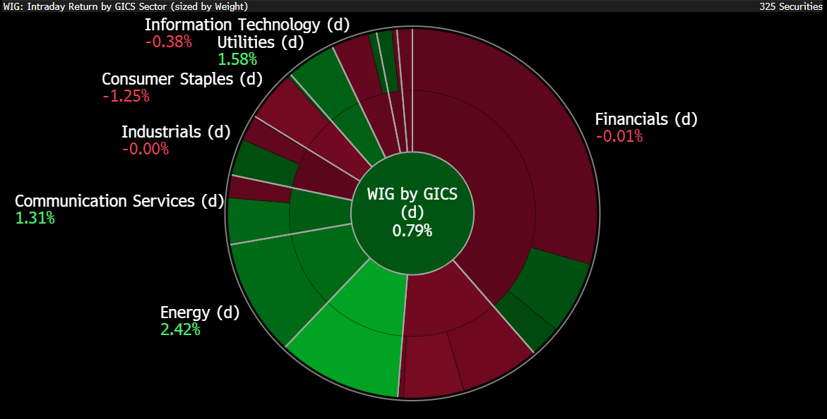 Na godzinę 13:15 WIG rośnie o 0.8%, WIG20 zyskuje 1.4%, natomiast mWIG40 spada o 0,1%, a sWIG80 traci 0.2%.