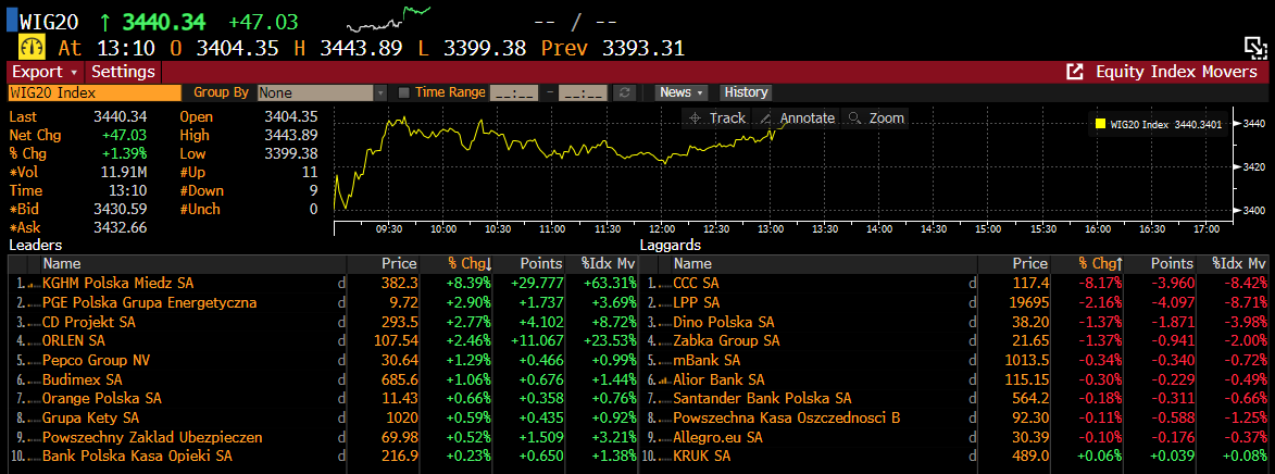 Na warszawskim parkiecie utrzymuje się przewaga popytu na największych spółkach. WIG20 kontynuuje wzrosty kolejny dzień z rzędu, podczas gdy indeksy małych i średnich firm pozostają pod presją podaży. Oznacza to wyraźną koncentrację kapitału w spółkach o najwyższej płynności i największej wadze w głównym indeksie. Wśród liderów wzrostów wyróżnia się KGHM, którego silne umocnienie ma istotny wpływ na zachowanie całego WIG20.