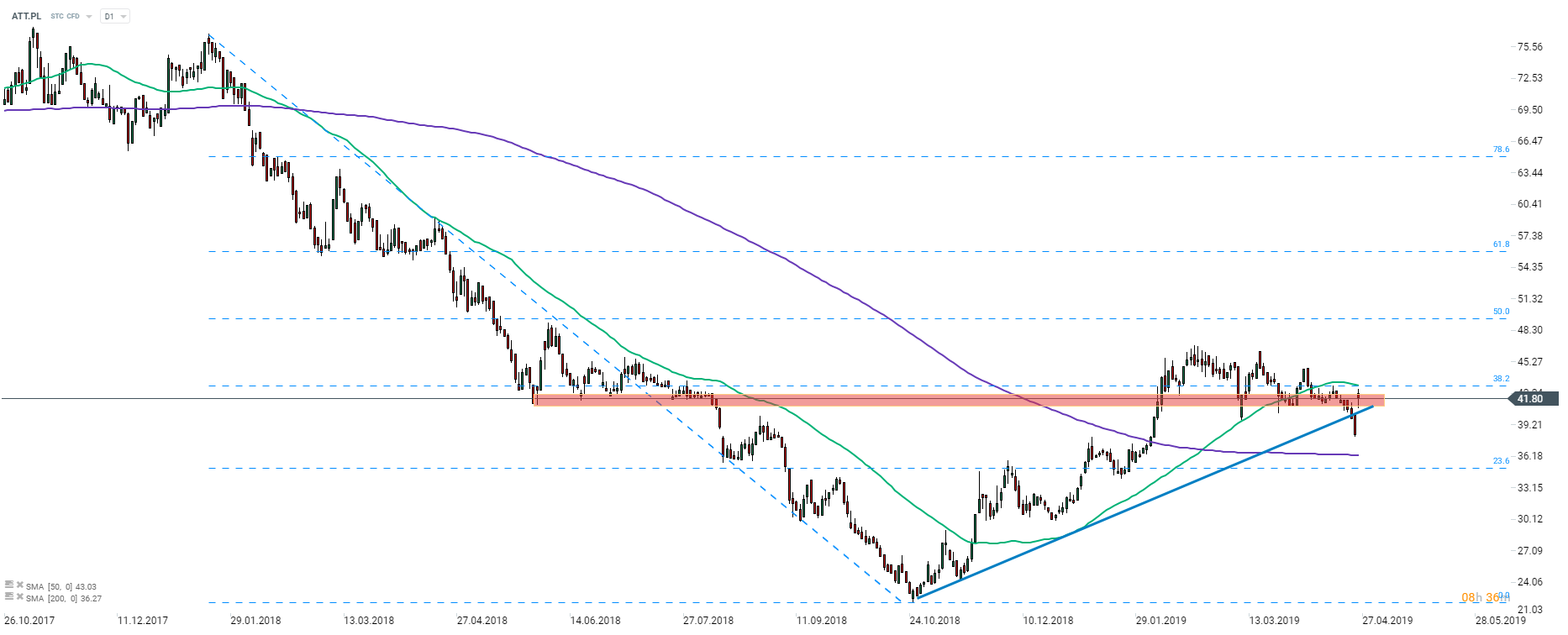 Po mocnych spadkach z 2018 roku, dzisiejszy wzrost kursu akcji Grupy Azoty (ATT.PL) daje trochę nadziei akcjonariuszom spółki. Niemniej jednak, cena znajduje się w obrębie strefy oporu oraz tuż poniżej kombinacji zniesienia 38,2% i 50-sesyjnej średniej kroczącej, tak więc dalsze wzrosty stoją pod znakiem zapytania. Źródło: xStation5