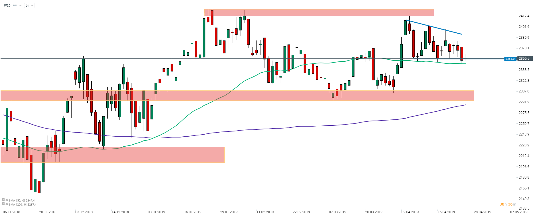 - WIG20 (W20) przy dolnym ograniczeniu formacji trójkąta