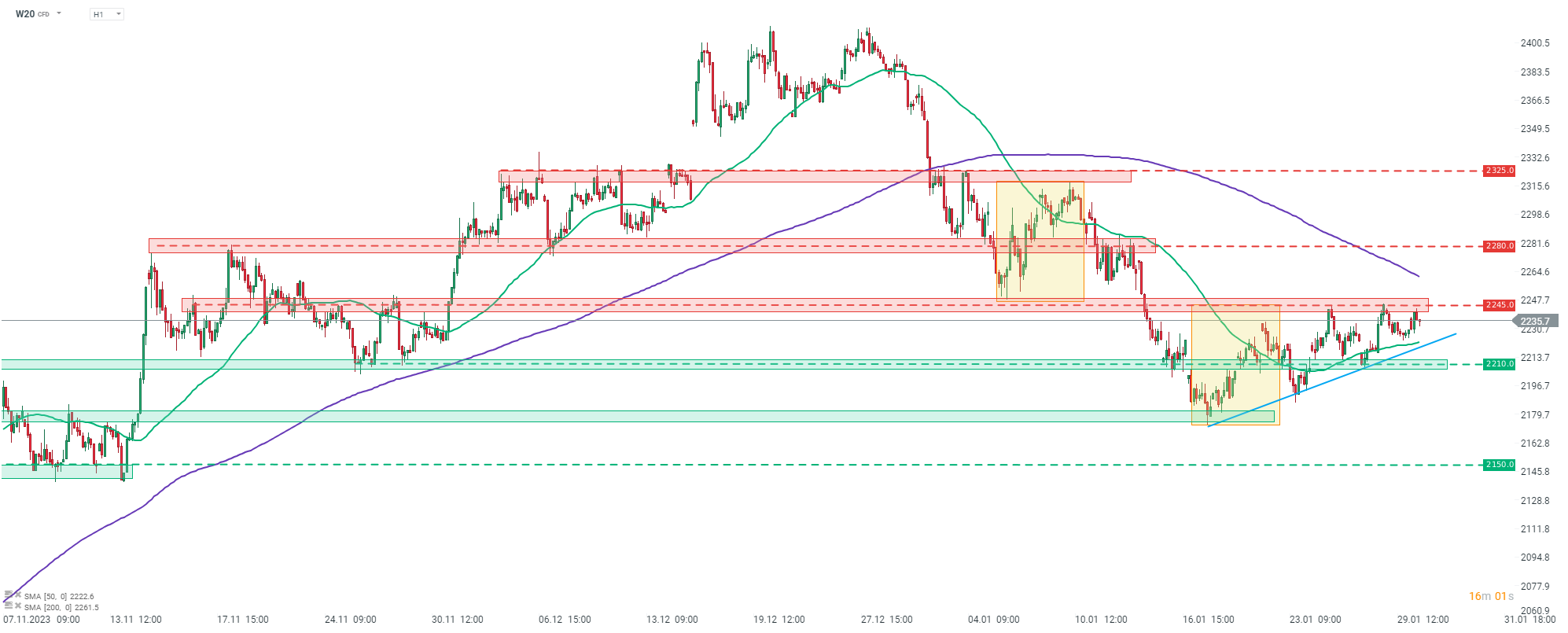 Kontrakty na indeks WIG20 (W20) notowane są dziś nieco wyżej. Patrząc na wykres na interwale H1, widzimy, że cena porusza się w formacji trójkąta zwyżkującego. Górne ograniczenie formacji stanowi strefa oporu przy 2 245 pkt, a dolne wzrostowa linia trendu. Indeks przetestował dziś górne ograniczenie, jednak kupującym nie udało się przebić wyżej i doszło do cofnięcia. Książkowy zasięg wybicia z formacji to około 70 punktów. Warto również zwrócić uwagę, że strefa przy 2 245 pkt jest dodatkowo wzmocniona przez górne ograniczenie lokalnej geometrii. Pokonanie strefy przy 2 245 pkt oznaczałoby potencjalną zmianę krótkoterminowego trendu na wzrostowy.