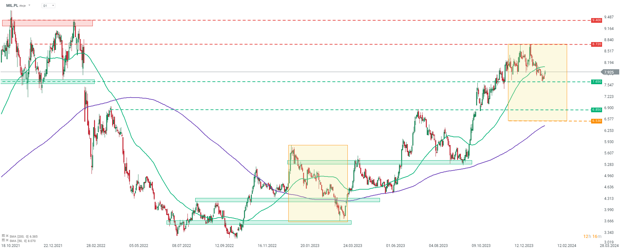 Akcje Banku Millennium (MIL.PL) rozpoczęły dzisiejszy handel luką wzrostową w odpowiedzi na publikację lepszych wyników od prognoz. Na wykresie kontynuowane jest odbicie rozpoczęte po nieudanej próbie przebicia się poniżej strefy wsparcia przy 7,65 PLN. Najbliższym potencjalnym oporem są okolice ostatnich szczytów przy 8,72 PLN, jednak aby tam dotrzeć, kupujący muszą najpierw pokonać 50-sesyjną średnią (zielona linia). Źródło: xStation5