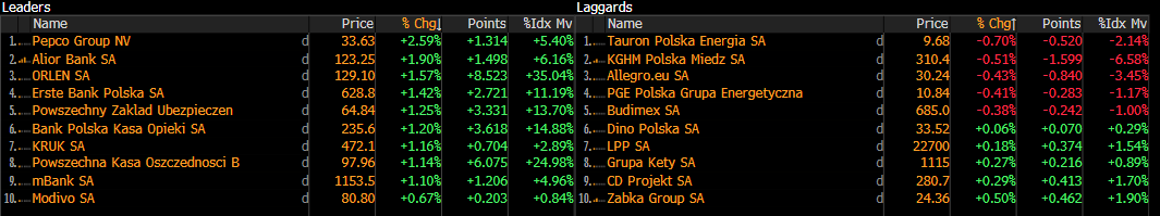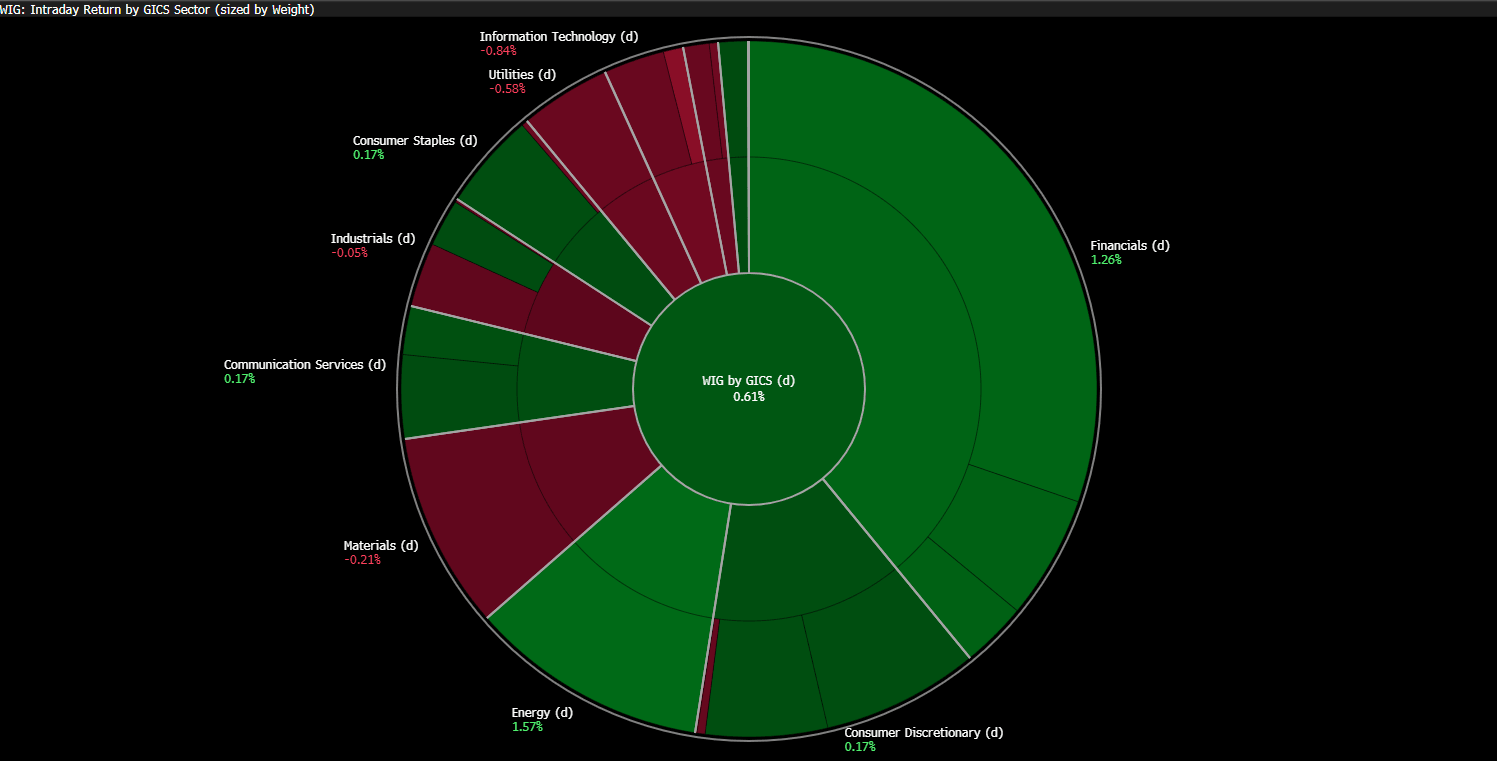 Na pierwszy plan ponownie wysuwa się sektor bankowy, który wyraźnie wspiera indeksy. Bank Millennium zaprezentował wyniki lepsze od prognoz, co przełożyło się na wzrost zainteresowania inwestorów. Podobny wydźwięk miała publikacja Alior Bank z poprzedniego dnia. W rezultacie widać, że mimo trudniejszego otoczenia, banki pozostają w dobrej kondycji i potrafią pozytywnie zaskakiwać rynek.