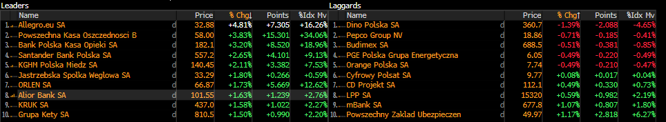 Najmocniej prezentuje się indeks WIG20, który mocno odbija po wczorajszych wysokich spadkach. Indeks zanotował wzrost od początku notowań o ok. 1,72%. Wśród głównych spółek zwyżkujących w indeksie dominuje Allegro z +4,81% wzrostem. Świetnie radzą sobie także banki, wśród których najmocniej odznacza się PKO (+3,83%) oraz Bank Pekao (+3,2%). Cały indeks WIG-Banki wzrósł jak na razie o +2,7%.