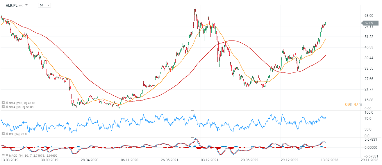 Akcje Alioru (ALR.PL) zbliżają się do rekordowych poziomów z 2021 roku przy 60 PLN za walor. Na tych poziomach możemy spodziewać się silniejszej presji spadkowej. Źrodło: xStation5