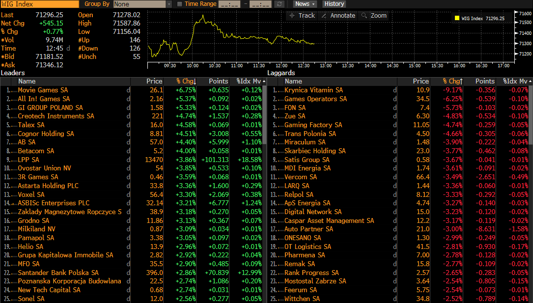 Euripejskie indeksy notowane są dziś nieznacznie wyżej - nastroje wsparły wczorajsze mocne wyniki Amazonu, choć Apple zdecydowanie nie zaskoczył tak pozytywnie raportując niższą sprzedaż większości urządzeń w tym smartphone'ów. Teraz uwaga inwestorów koncentruje się na raporcie NFP z USA, który poznamy o 14:30 - jego odczyt może zdeterminować reakcje rynków w końcówce tygodnia. Zarówno bardzo mocne jak i bardzo słabe dane wydają sie niekorzystne dla rynków - idealny byłby odczyt bliski oczekiwaniom. Lepszy sentyment obserwujemy dziś na akcjach banków i spółek z sektora budowlano-przemysłowego m.in. Mirbud (MRB.PL), MoBruk (MBK.PL) czy Cognor (COG.PL). Premier Morawiecki wskazał, że 25 mld PLN może trafić do polskich firm w ramach kolejnej edycji programu Inwestycji Strategicznych.