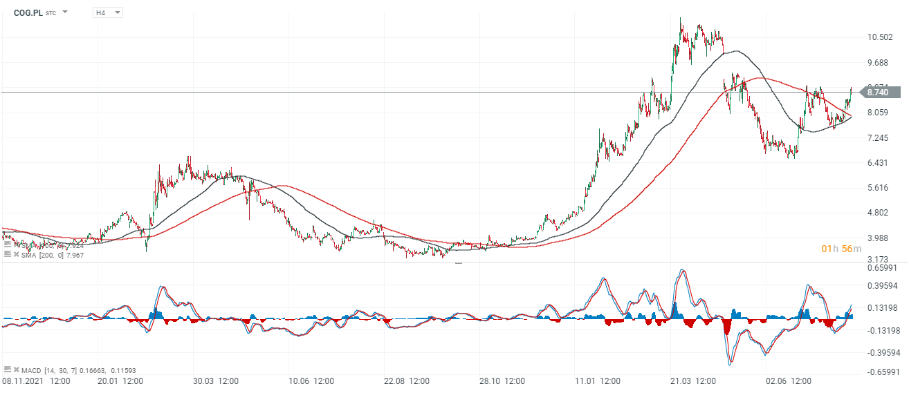 Akcje Cognor (COG.PL), interwał H4. Od strony wykresu warto zwrócić uwagę na średnie SMA200 i SMA100, które zbliżają się do utworzenia formacji złotego krzyża na interwale H4 - patrząc historycznie takie momentum poprzedzało zwyżkę cen akcji (choć nie musi się to powtórzyć). Byczo wygląda MACD, który wyłamał się ze spadkowej strefy. Źródło: xStation5