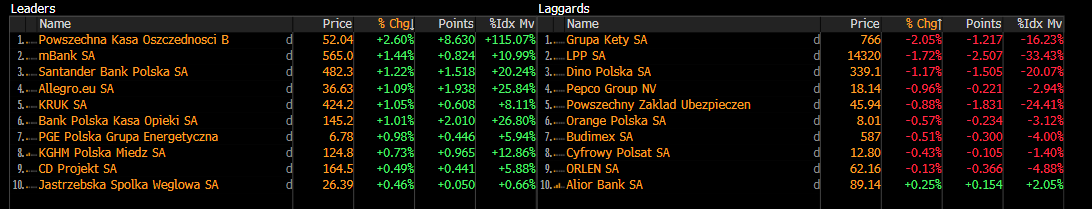 Indeks blue chipów rośnie dziś lekko ponad 0,3%, a wśród najlepiej radzących sobie spółek wyróżniają się przede wszystkim banki, których subindeks WIG-Banki wzrósł dzisiaj 1,7%. Wśród dużych spółek najlepiej radzi sobie PKO (+2,6%), mBank (+1,4%) oraz Santander (+1,2%).