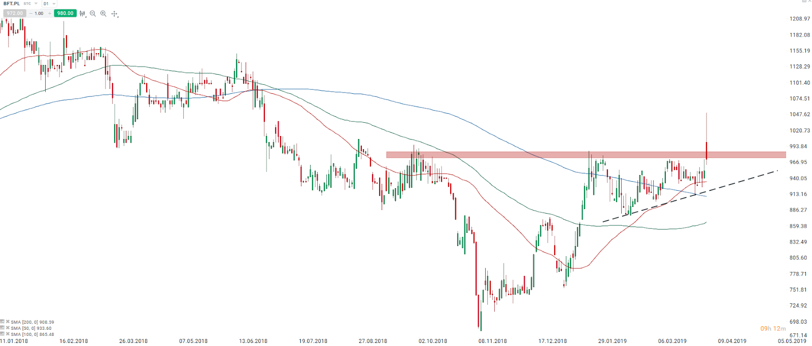 Na starcie sesji Benefit był jedną z najsilniejszych spółek na całym parkiecie, jednak poranne wzrosty zostały w dużej mierze zniesione i obecnie spółka ponownie powraca poniżej oporu. Źródło: xStation5.