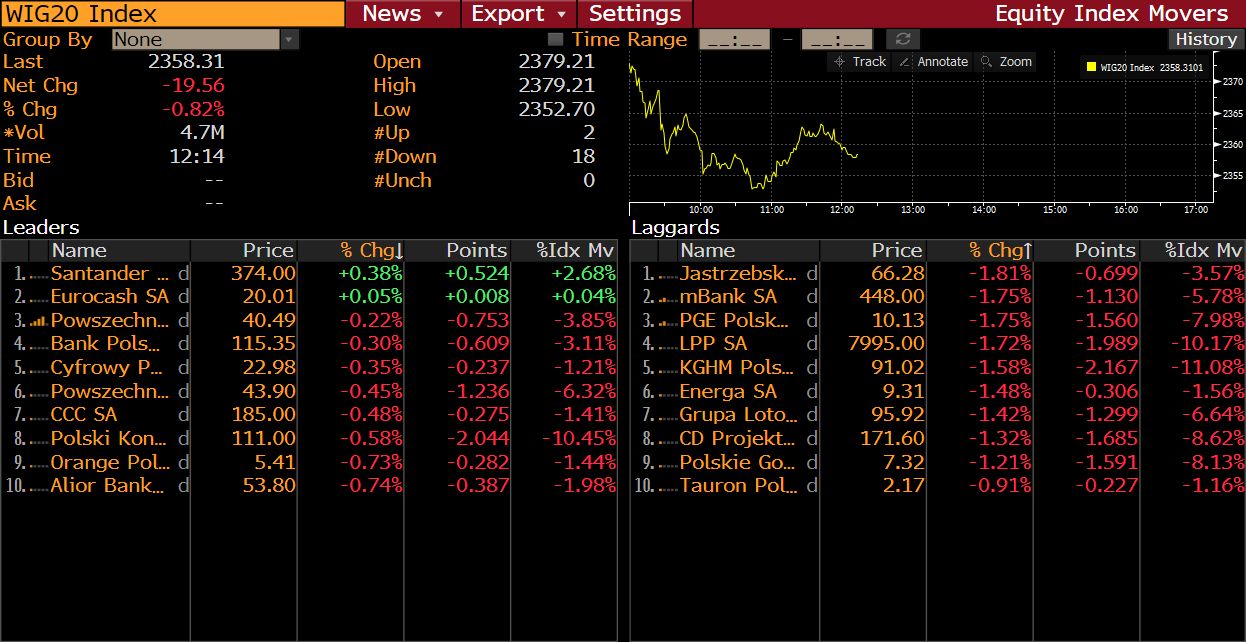 Nowy tydzień rozpoczął się spadkami na rynkach akcji w całej Europie. Również czerwień widoczna jest na Książęcej, a jedynym indeksem powyżej kreski jest SWIG80. WIG20 (W20) nie jest w stanie pokonać kilkumiesięcznych maksimów w okolicy 2380 pkt. Również kontrakty na amerykańskie indeksy wskazują na ujemne otwarcie. Dzisiaj na Wall Street nie mamy zbyt wielu ważnych publikacji od spółek za 4 kwartał, jednak jutro wyniki ponownie wejdą na główny plan. Swoje raporty przedstawi Johnson&Johnson (JNJ.US), czy UBS (UBS.US).
