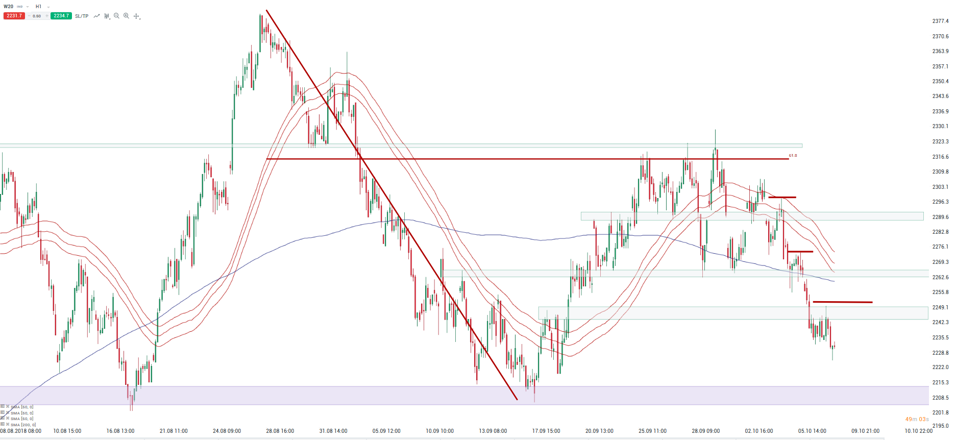 Na wykresie godzinowym W20 utrzymana zostaje struktura coraz niższych dołków i szczytów. Rynek wydaje się kierować w kierunku wsparcie w rejonie 2200-2210 pkt., które w ostatnich tygodniach dwukrotnie powstrzymały spadki. Jeśli poranne odreagowanie miałoby być kontynuowane po starcie sesji na Wall Street, to pierwszym celem dla byków powinno być pokonanie 2250 pkt. Źródło: xStation5.