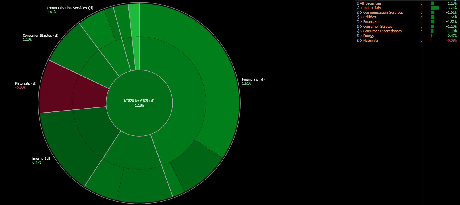 Wzrosty można dziś obserwować na praktycznie całym przekroju WIGu20, szczególnie dobrze radzi sobie jednak przemysł. W tyle zostają spółki energetyczne i górnicze.