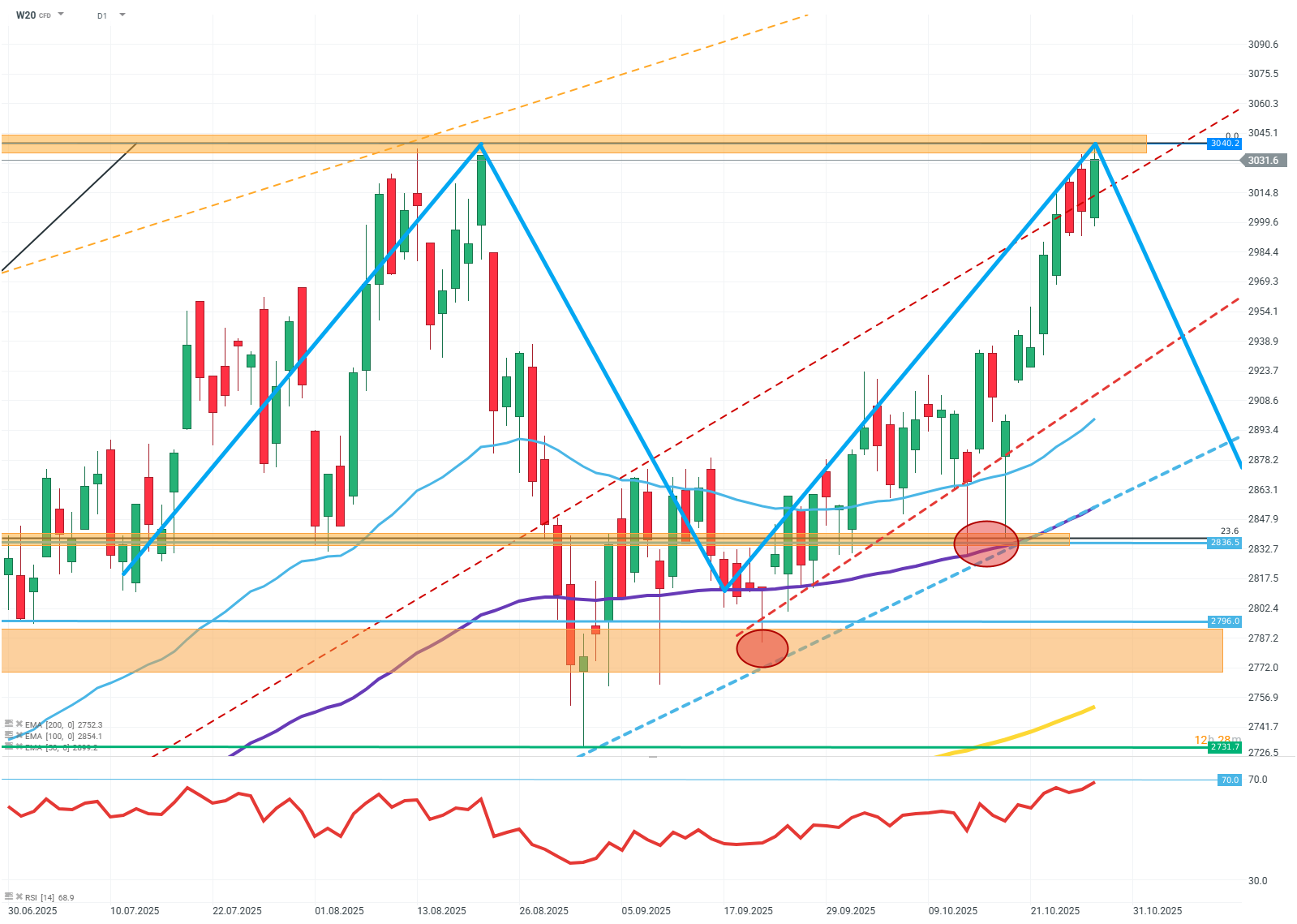 Na wykresie można obserwować o ostatnich miesiącach formowanie się formacji podwójnego szczytu. Bazowym scenariuszem jest odbicie się kursu od poziomu 3040 i strefy oporu FIBO 0 oraz korekta w okolice 2840 punktów gdzie za silne wsparcie będzie służyć poziom FIBO 23.6. Jeśli kupujący chcą zanegować ten scenariusz muszą wybić się i utrzymać kurs powyżej poziomu 3050. Dodatkowo na niekorzyść kupujących działa podwyższony RSI(14) sygnalizujący wykupienie.