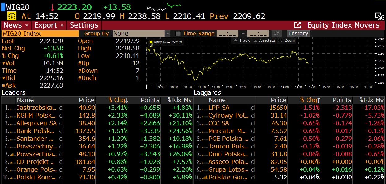 Spółki wchodzące w skład indeksu WIG20 (W20) i ich największe zmiany procentowe w ujęciu dziennym. Źródło: Bloomberg