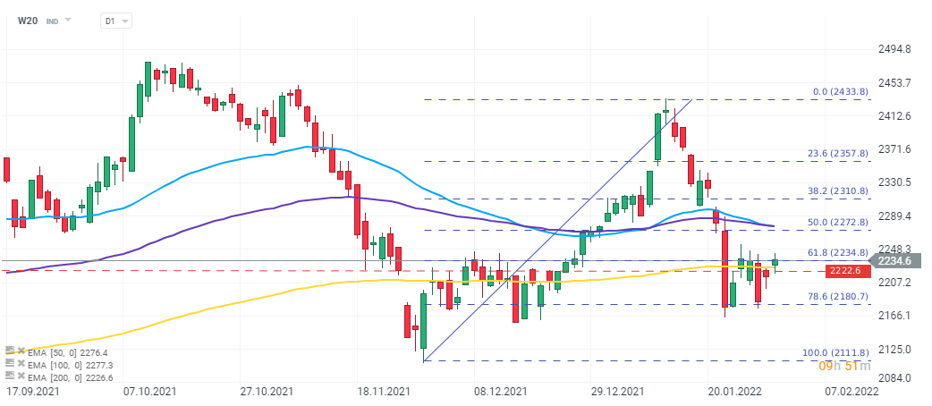 Indeks polskich blue-chipów zdołał wejść powyżej ograniczenia wyznaczonego przez EMA 200 (złota linia) i obecnie próbuje trwale wybić się powyżej mierzenia 61,8% Fibo. Lokalnym, najważniejszym wsparciem pozostaje poziom blisko 2180 punktów, gdzie znajduje się lokalne dno ostatnich, silnych przecen. Bycze otwarcie dzisiejszej sesji w USA może pozytywnie wpłynąć na notowania indeksu W20, dla którego najbliższym oporem może być zniesienie 50%.