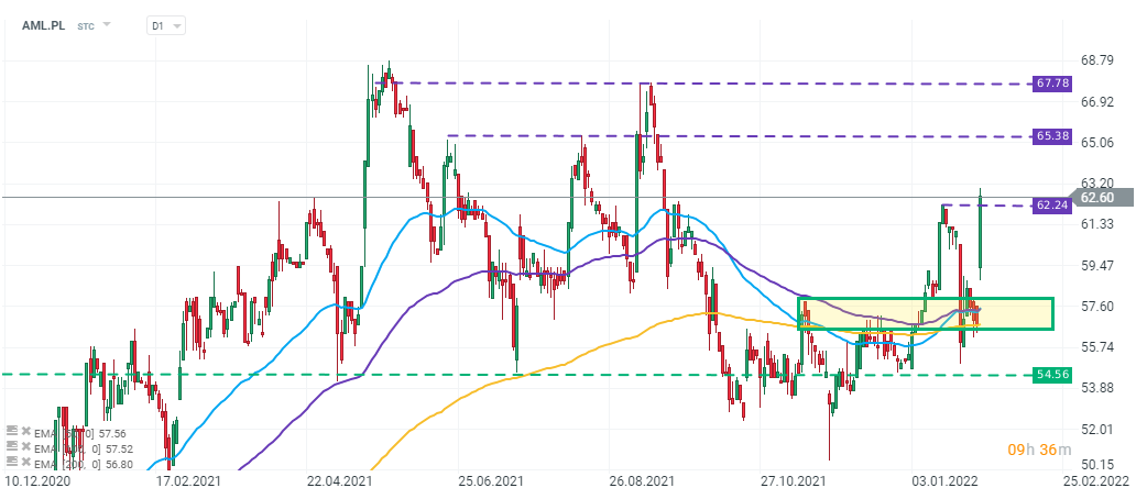 Wykres akcji spółki Alumetal (AML.PL), interwał D1. Dzisiejsza sesja przyniosła silne wybicie górą notowań firmy, które zasięgiem przekroczyły lokalny szczyt z 17 stycznia. Jeśli cena natomiast zawróci i nie uda się utrzymać powyżej wspomnianego szczytu, najbliższego wsparcia możemy szukać w strefie pomiędzy 56 a 58 zł za akcję, a później 54,5 zł za akcję. Kolejnym oporem mogą być szczyty z drugiej połowy 2021 roku, zaznaczone na fioletowo. Źródło: xStation 5